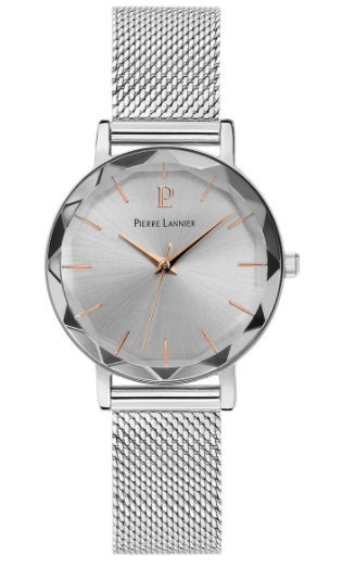 Montre Pierre Lannier 009M628 collection Multiples présente un cadran acier agrémenté d’un verre facetté au boîtier acier sur un bracelet milanais acier.