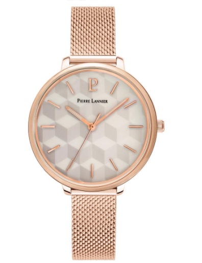 La Montre Femme Mirage 027L998 acier milanais doré rose est dotée d’un cadran très original : fait de nacre et de motifs géométriques façon 3D, il affirmera votre féminité délicate et souple.