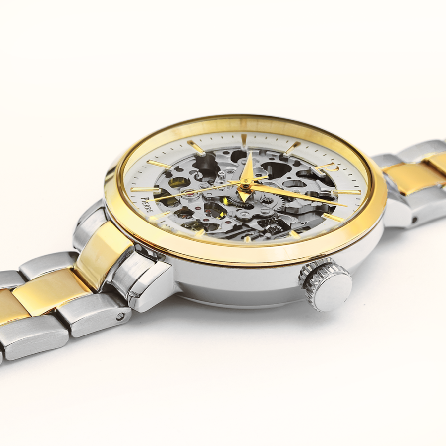 Laissez vous captiver par son design squelette qui vous dévoile les rouages de votre montre . Son colori bicolor au rendu esthétique qui associe l’or et l’argent à s’accordera parfaitement avec toutes vos tenues.